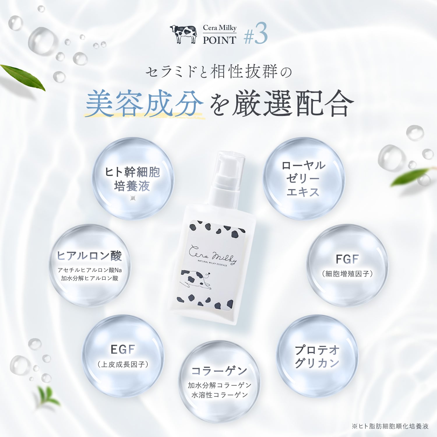【全成分】水、ラウロイルグルタミン酸ジ(フィトステリル/オクチルドデシル) 、BG、ペンチレングリコール、DPG、水添レシチン、 グリセリン、ヘキシルデカノール、ラウリン酸ポリグリセリル-10 ヒドロキシアセトフェノン、フェノキシエタノール、トコフェロール、アセチルヒアルロン酸Na、加水分解ヒアルロン酸、PEG-60水添ヒマシ油、加水分解ローヤルゼリータンパク、コハクエキス、加水分解コラーゲン、ヒト脂肪細胞順化培養液エキス、セラミドAP、乳酸、ローヤルゼリーエキス、乳酸Na、(クエン酸/乳酸/リノール酸/オレイン酸)グリセリル、オリーブ果実油、水溶性プロテオグリカン、マンニトール、チューベロース多糖体、1,2-ヘキサンジオール、カプリリルグリコール、ポリソルベート60、トロポロン、セラミドNP、水溶性コラーゲン、ヒト遺伝子組換オリゴペプチド-1、ヒト遺伝子組換ポリペプチド-11、乳酸桿菌/乳発酵液(牛乳)、エタノール、メチルパラベン、リン脂質、スフィンゴ脂質
